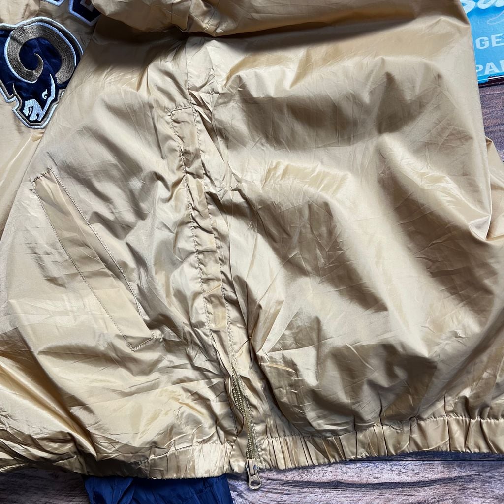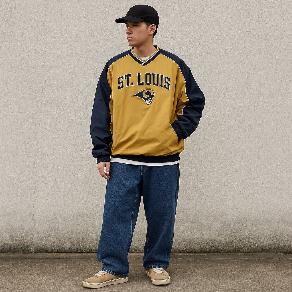 1990〜2000年代頃の NFL St. Louis Rams プルオーバージャケット です。フロントにチームロゴ刺繍入りで存在感抜群。ナイロン素材で軽量かつ扱いやすく、ストリートコーデやスポーツMIXにも最適な一着です。