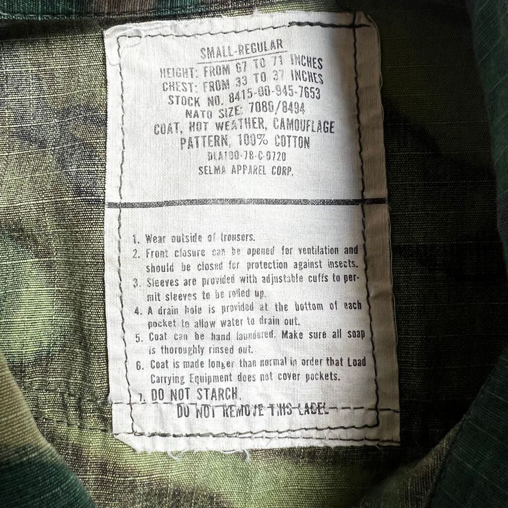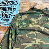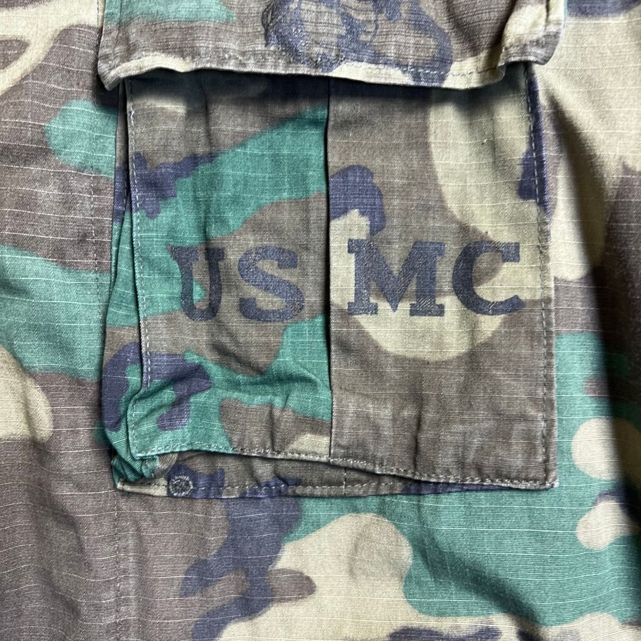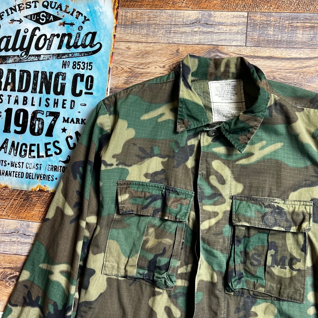 米軍実物の ファティーグジャケット(ウッドランドカモ)。タグには「COAT, HOT WEATHER, CAMOUFLAGE PATTERN, 100% COTTON」と明記された正規品で、背面にはUSMCステンシル入り。軽量で通気性が高く、春秋の羽織りやストリートコーデにも映える人気アイテムです。