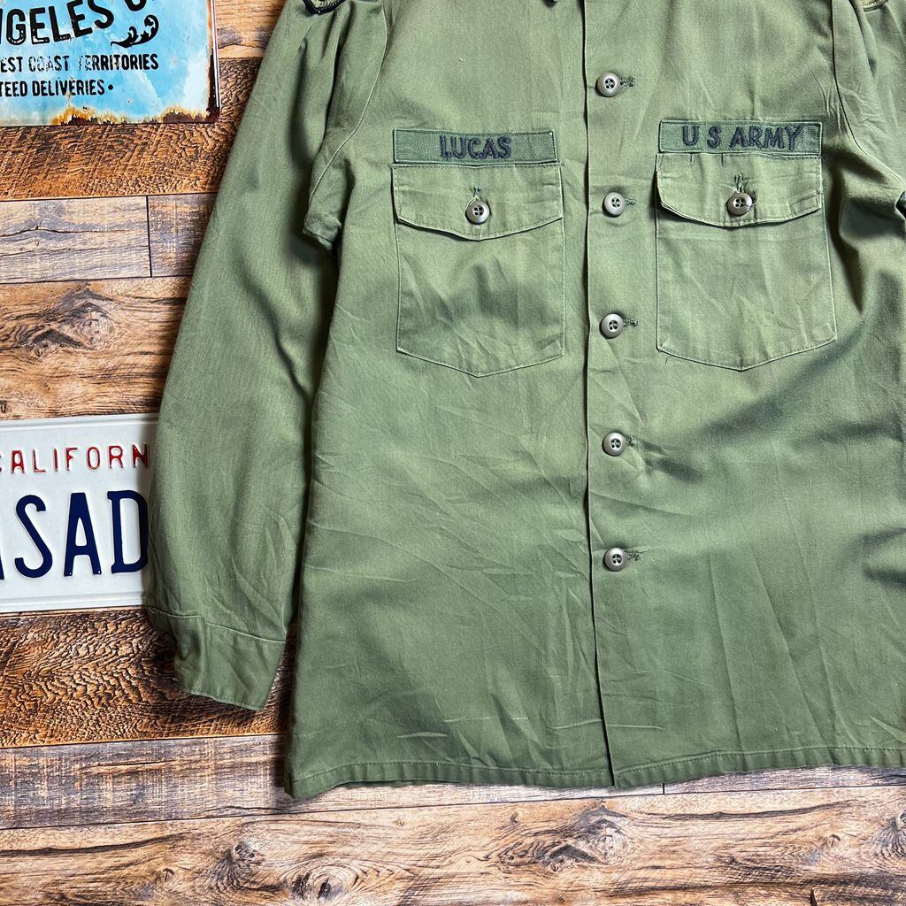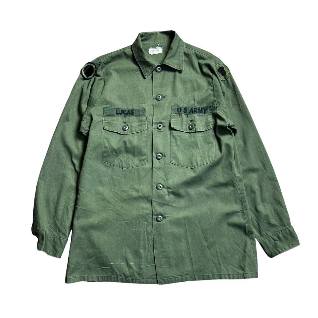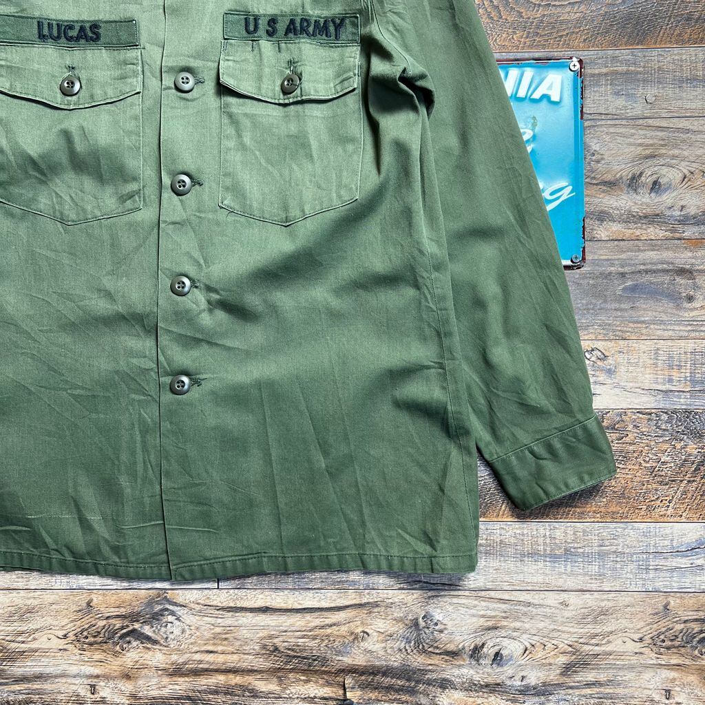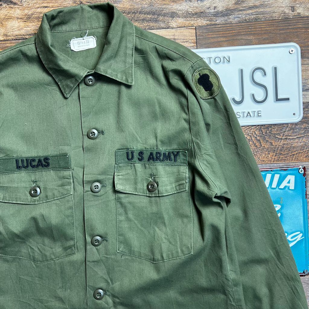 全体的に使用感がありますが、まだ十分に着用可能なコンディションです。両胸にネームテープとUS ARMYテープ、肩にワッペンがあり、リアルミリタリーらしい雰囲気を楽しめます。