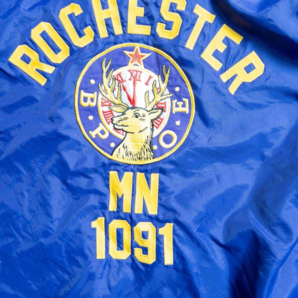 フロントにはネーム刺繍「Lorraine」、バックには「ROCHESTER MN 1091」およびエルクのワッペンが施された存在感あるデザインです。