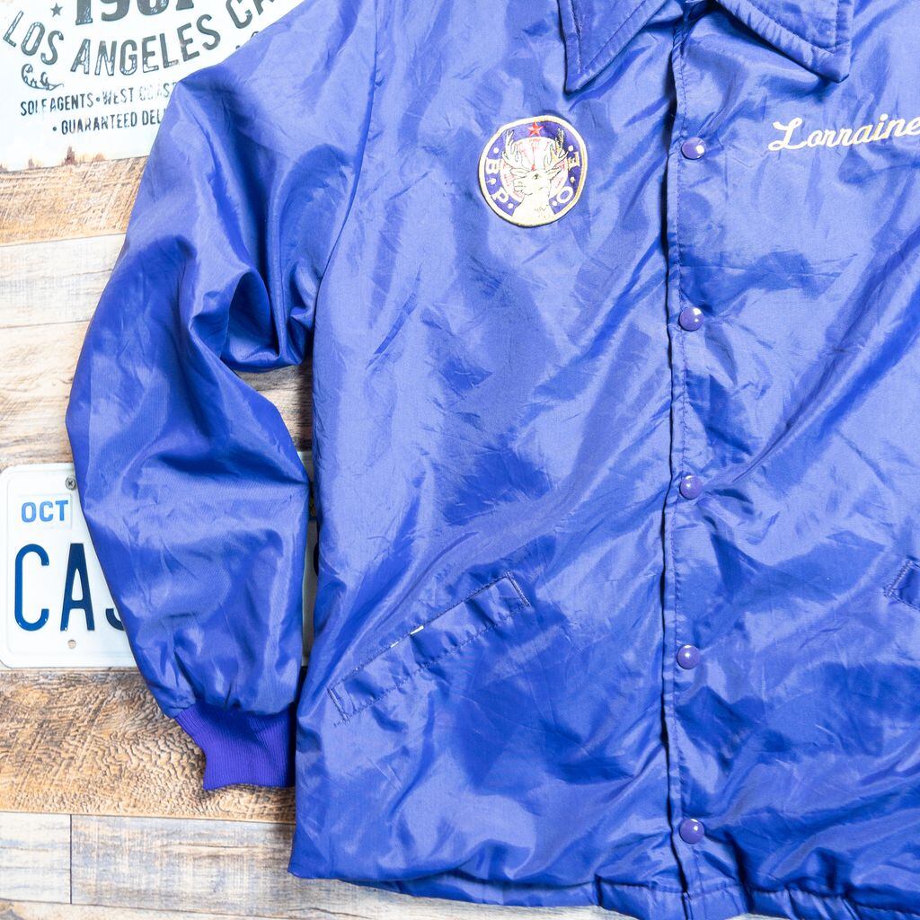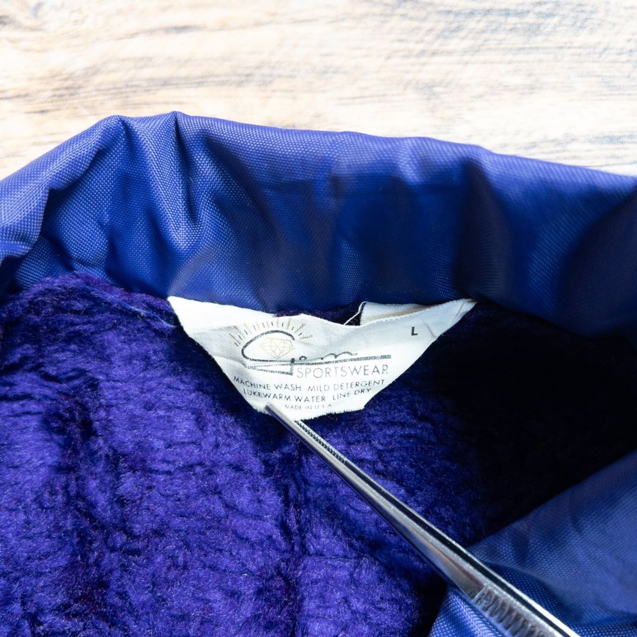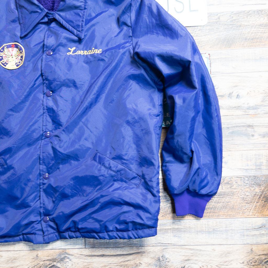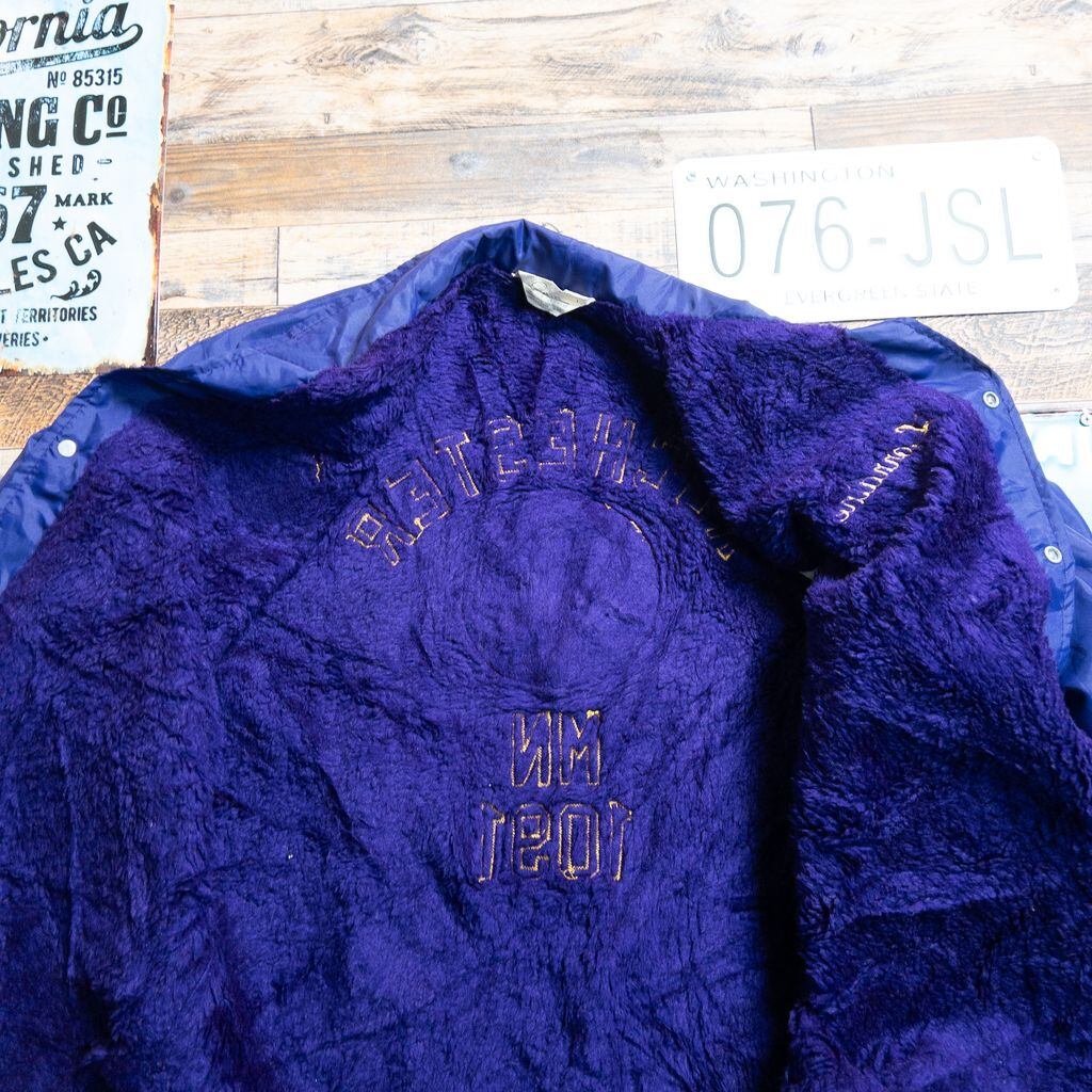 アメリカらしい発色の良いパープルカラーで、古着コーデやストリートスタイルにもおすすめの一着です。