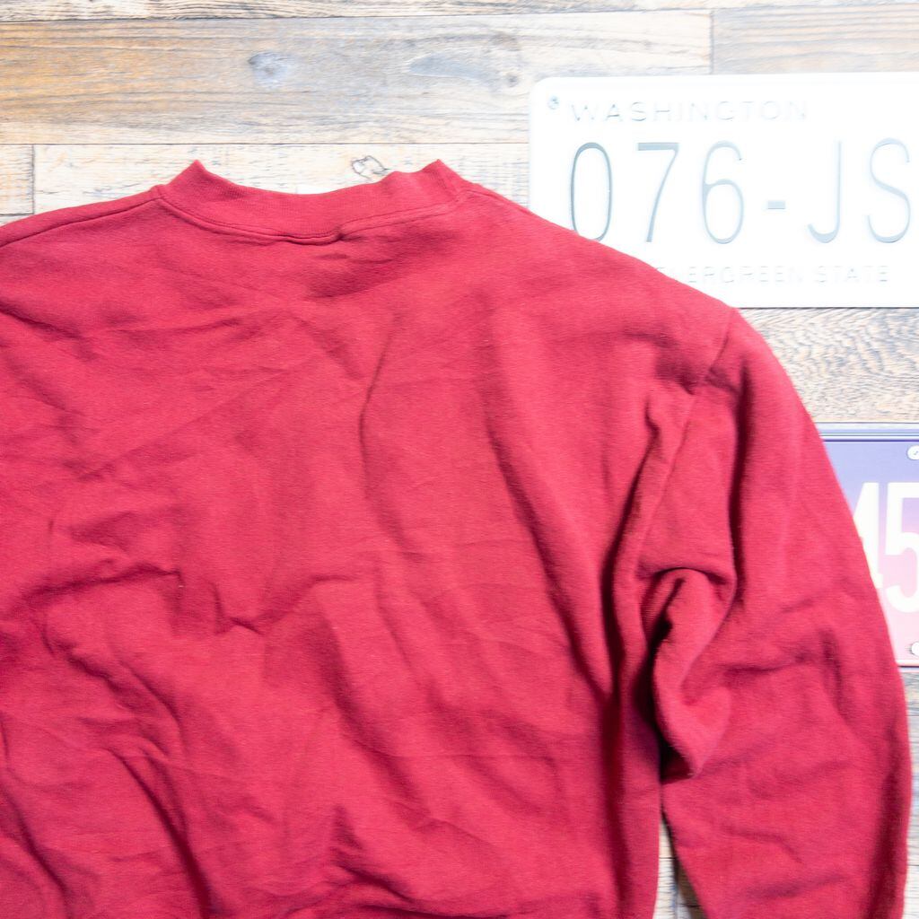 存在感あるカレッジプリントと褪せたバーガンディカラーが、90sらしい雰囲気を演出します。