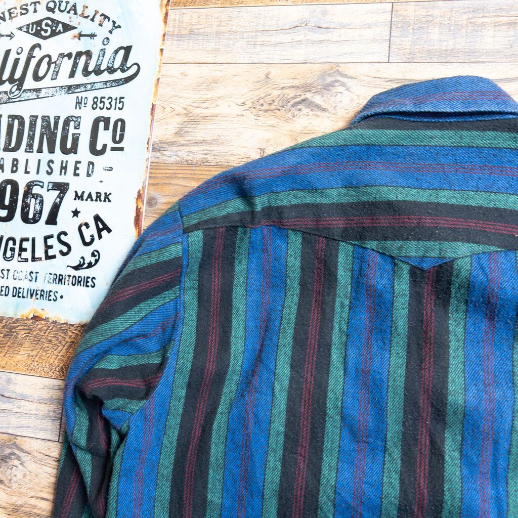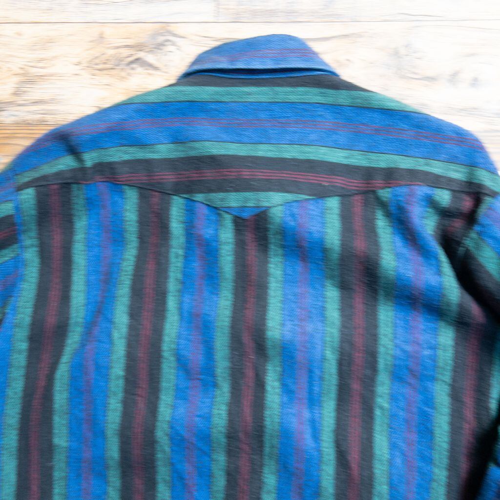 ブルーやグリーンを基調としたストライプパターンで、ヴィンテージらしい存在感のある一着。