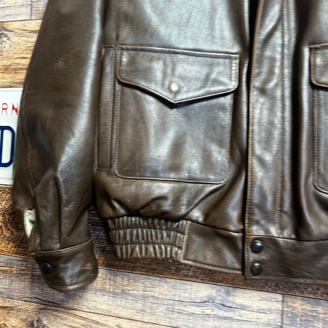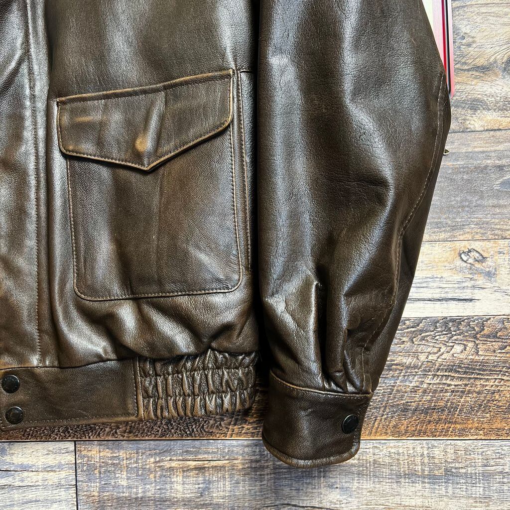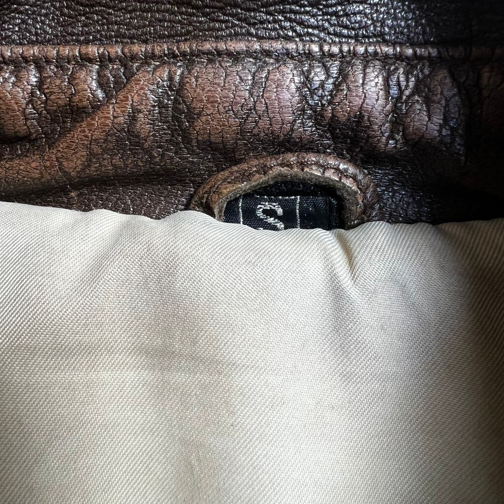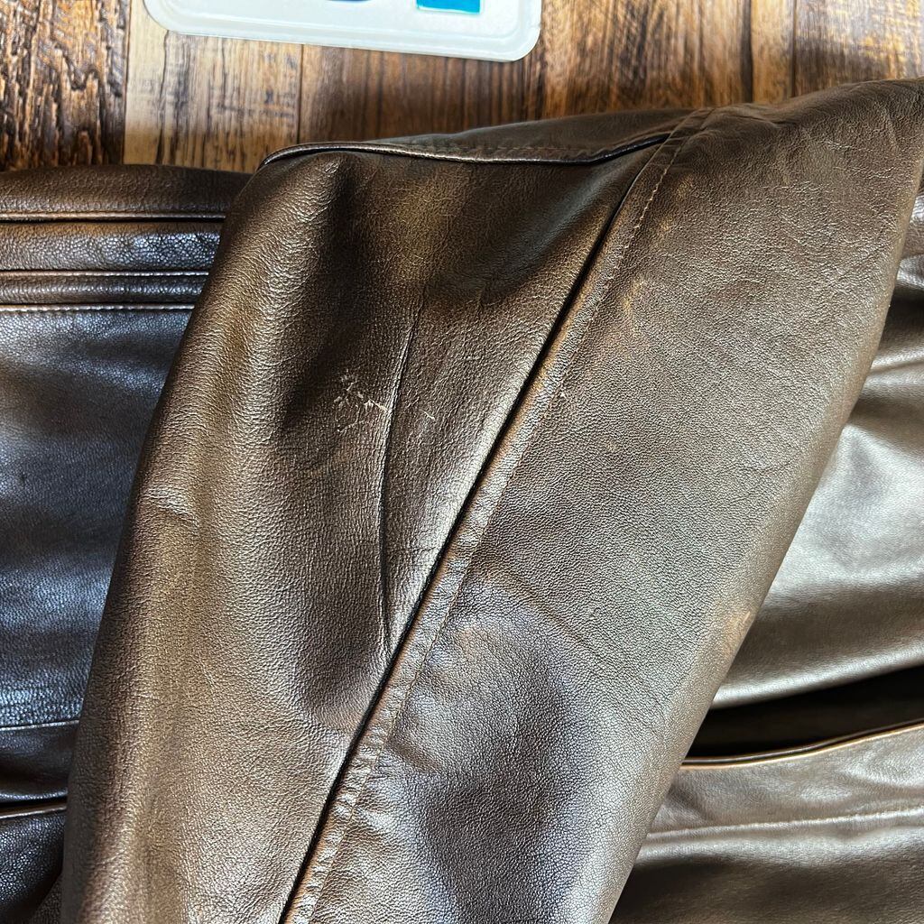 レザー特有の経年変化・シワ・風合いが見られますが、着用に支障のある破れはありません。