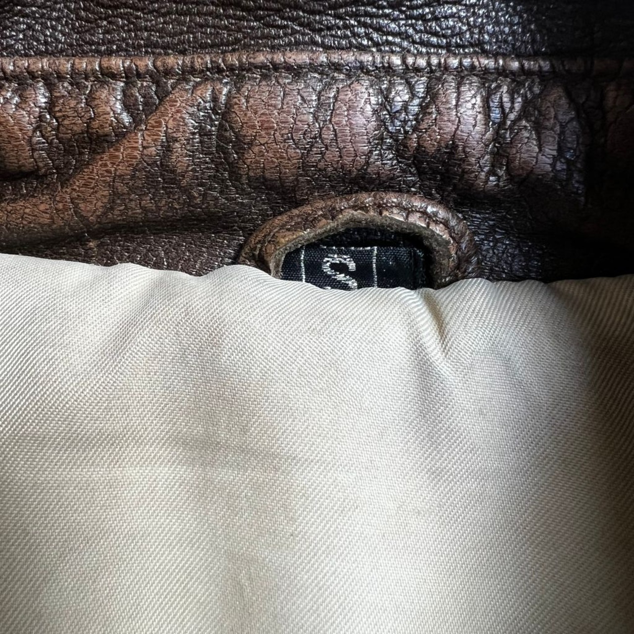 裏地の襟元付近とブランドタグに汚れがあります。